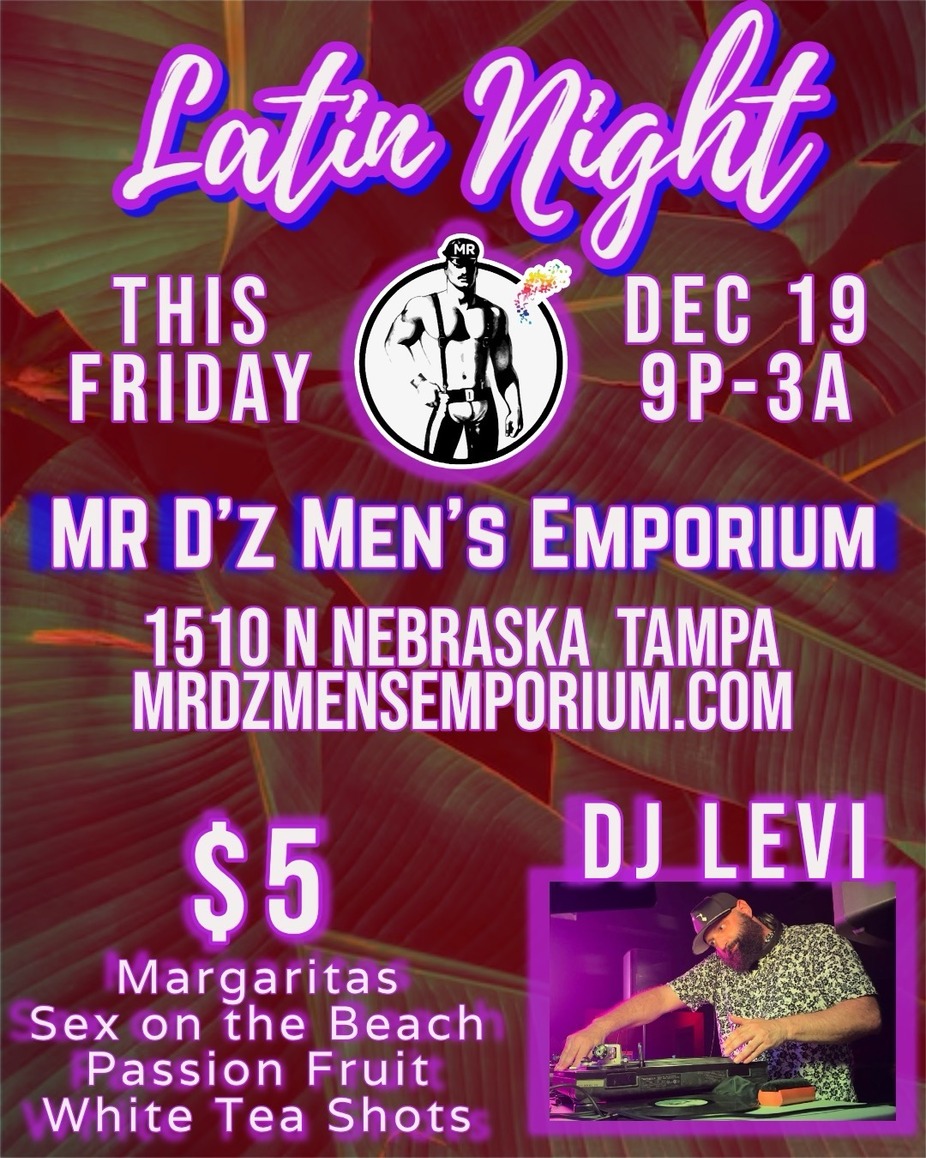 “All roads lead” to MR D’z Men’s Emporium 🍹🍸🍷🥃🥂🍺🎼🎤🕺🏻 Don't miss all the first and third Fridays of each month is ~ Latin Night ~ 🎼🕺🏻💃🕺🏻🎼 We're waiting for you this Friday, December 5, to have a good time dancing all night, with the best DJ in Tampa Bay Stevey Infiniti Newnez giving it all! As always the entrance is Free and enough parking for everyone, with delicious drinks all night, with their sexy bartenders Reinaldo Samuel and Vernon Vaden Special drinks of the Night $5.00 Margaritas $5.00 Sex on the Beach $5.00 Pation Fruit / White Tea shots Here we are waiting for you at 9pm at Mr. D’z