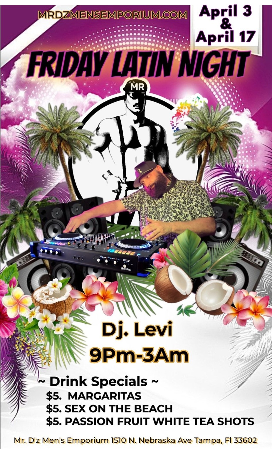 “All roads lead” to MR D’z Men’s Emporium 🍹🍸🍷🥃🥂🍺🎼🎤🕺🏻 Don't miss all the first and third Fridays of each month is ~ Latin Night ~ 🎼🕺🏻💃🕺🏻🎼 We're waiting for you this Friday, December 19, to have a good time dancing all night, with a surprise appearance by the awesome DJ Levi giving it his all to keep you dancing the night away! As always the entrance is Free and enough parking for everyone, with delicious drinks all night, with their sexy bartenders Reinaldo Samuel and Vernon Vaden Special drinks of the Night $5.00 Margaritas $5.00 Sex on the Beach $5.00 Pation Fruit / White Tea shots Here we are waiting for you at 9pm at Mr. D’z